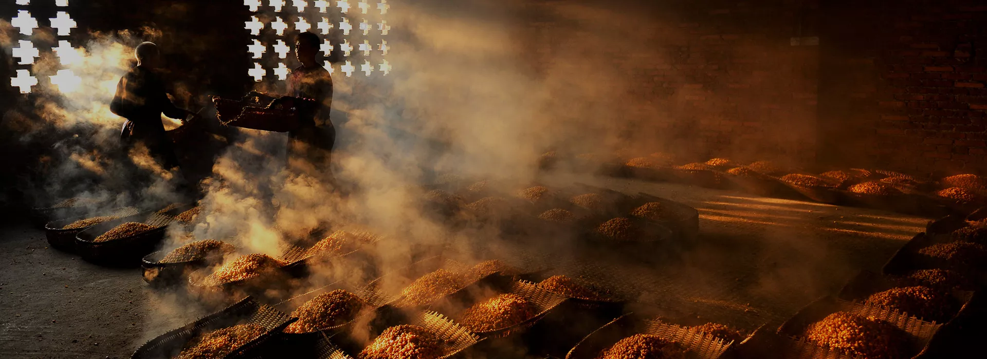五谷原料经过破碎,配料,拌料,蒸煮糊化,低温入窖,精华物质在古老的窖池中,经过长达两个多月的发酵